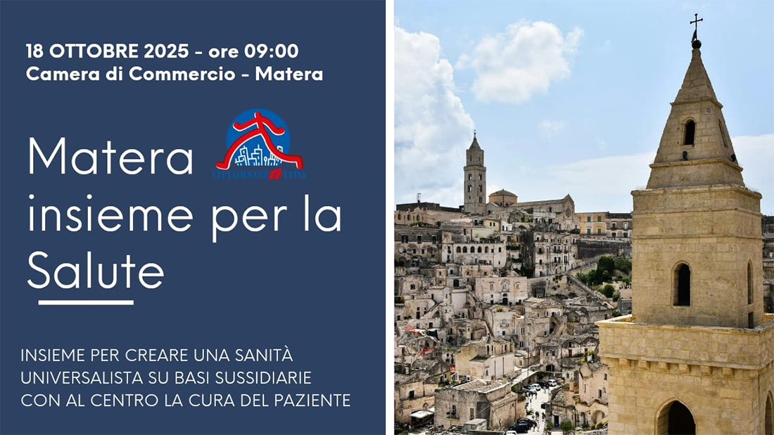Cittadinanzattiva Basilicata-Assemblea di Matera promuove il seminario "Insieme per la Salute", un 'occasione di confronto tra istituzioni, professionisti, cittadini e organizzazioni civiche sul futuro del Servizio Sanitario Nazionale, con al centro la cura del paziente.