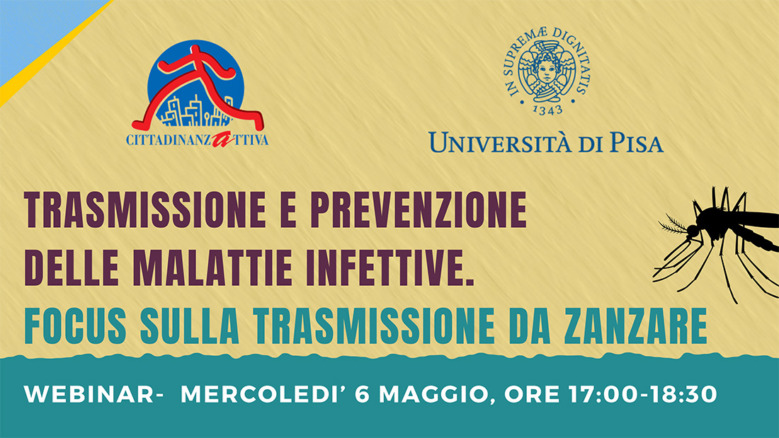 La Scuola di Cittadinanzattiva, in collaborazione con l’Università di Pisa, è lieta di invitarvi a un webinar gratuito che si terrà il prossimo 6 maggio, dalle ore 17.00 alle 18.30, dal titolo: “Trasmissione e prevenzione delle malattie infettive. Focus sulla trasmissione da zanzare”.