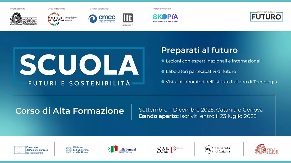 Come affrontare i grandi cambiamenti del nostro tempo? Quali competenze servono per guidare le trasformazioni che ci attendono? Per rispondere a queste domande nasce la prima edizione della Scuola di alta formazione “Futuri e Sostenibilità”, promossa dalla Scuola Superiore dell’Università di Catania e organizzata dall’Alleanza Italiana per lo Sviluppo Sostenibile (ASviS) con l’obiettivo di formare giovani capaci di orientare il cambiamento, affrontare la complessità e contribuire attivamente alla costruzione di un futuro sostenibile.