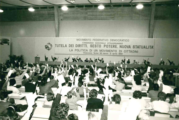 Nel decennio 1980-1989, il Movimento vive la sua fase di fondazione, in particolare con l’ideazione e promozione di iniziative di “democrazia diretta”, volte a coinvolgere i cittadini quali attori per la tutela dei propri diritti nei campi della vita pubblica come la salute (con il Tribunale per i diritti del malato), la protezione civile, i servizi pubblici e i servizi per le donne, l’ordine pubblico e la questione giovanile. In un decennio dove domina la partitocrazia, la posizione del Movimento, che lavora per non costituire un partito e praticare l’autonoma iniziativa politica dei cittadini senza presentarsi alle elezioni, è decisamente un elemento di rottura e a molti appare ingenua o velleitaria.