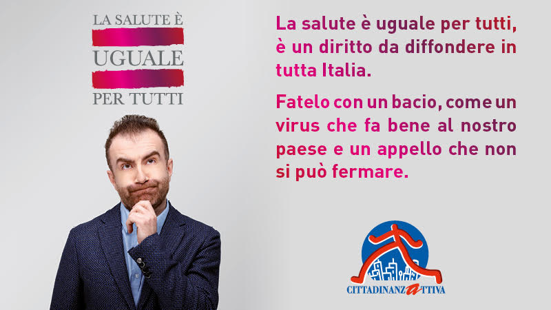 è stata presentata stamattina “La salute è uguale per tutti”, la campagna di riforma costituzionale promossa da Cittadinanzattiva con il supporto di oltre 50 realtà fra organizzazioni civiche, associazioni mediche e di pazienti, e di numerosi testimonial del mondo istituzionale, dell’impresa, della cultura e dei mass media. Un’integrazione all’art.117 della Costituzione è lo strumento messo a punto per contribuire alla riduzione delle disuguaglianze in ambito sanitario. La proposta sarà sostenuta dalla campagna social #diffondilasalute (www.diffondilasalute.it), per chiedere a tutti i cittadini di attivarsi a sostegno della tutela del diritto alla salute. Da oggi cittadini e testimonial possono contribuire a “diffondere la salute” con un bacio che diventerà il simbolo di un “contagio” virtuoso.