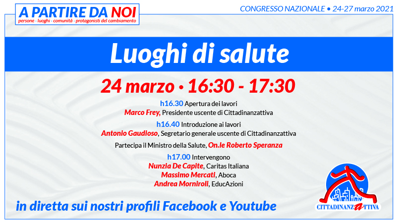 L’evento è il primo di tre momenti di confronto e analisi su alcuni temi prioritari per Cittadinanzattiva in vista del Congresso nazionale, dal titolo “A partire da noi. Persone, luoghi e comunità protagonisti del cambiamento”, che si celebra sabato 27 marzo per l’elezione del Segretario generale, del Presidente nazionale, nonché dei componenti del Collegio di Garanzia e dell’Organo di Amministrazione.