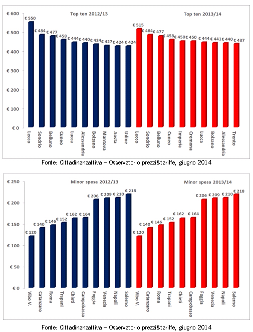 Le 10 città più care e quelle meno care. Nella top ten delle città più care, tra quelle che offrono il servizio a tempo pieno, si confermano, rispetto al 2012/13, Lecco, Sondrio, Belluno, Cuneo, Alessandria, Bolzano e Aosta mentre Imperia, Cremona e Trento subentrano al posto di Mantova, Pavia e Udine. La graduatoria delle 10 città meno care rimane totalmente inalterata: Vibo Valentia, Catanzaro, Roma, Trapani, Chieti, Campobasso, Foggia, Venezia, Napoli e Salerno.
