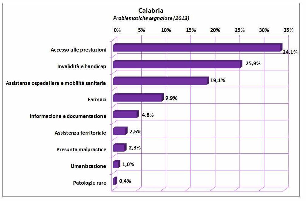 Sebbene il rientro dal disavanzo sia ad oggi un risultato raggiunto, quale è stato l’effetto sui cittadini calabresi? Nella tabella che segue ecco in estrema sintesi i principali problemi segnalati dalle persone che si sono rivolte nel corso del passato anno al PiT Salute, il servizio di orientamento e tutela del Tribunale per i diritti del malato, e presentato a Roma il 30 settembre.