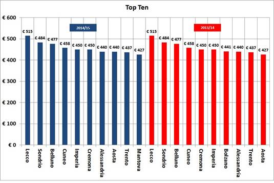 Nella top ten delle città più care, tra quelle che offrono il servizio a tempo pieno, si confermano, rispetto al 2013/14, Lecco, Sondrio, Belluno, Cuneo, Alessandria, Imperia, Cremona, Trento e Aosta mentre Mantova subentra a Bolzano.