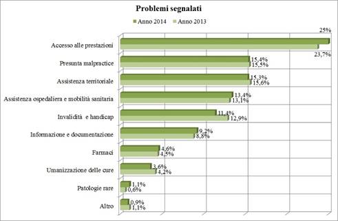 Al terzo posto nelle preoccupazioni dei cittadini (15,3%). In particolare, l’assistenza sanitaria di base (medici di famiglia e pediatri) fa registrare un chiaro aumento del volume di segnalazioni, dal 25,7% del 2013 al 30,1% del 2014, soprattutto perché i cittadini si vedono negata una visita a domicilio o il rilascio di una prescrizione. Il dato sulla riabilitazione (18%) continua a evidenziare in particolare i disagi legati alla mancanza o scarsa qualità dei servizio in ospedale o alla difficoltà nell'attivazione di quello a domicilio. Una voce molto importante è quella che si riferisce ai servizi per la salute mentale, con il 13,9% delle segnalazioni per il 2014, a fronte di un problema ormai cronico e ingravescente a causa della mancanza di risorse e personale destinati a quest’area di servizi; fra le criticità più segnalate appaiono il ricovero in strutture inadeguate (dal 22,2% del 2013 al 27,9% del 2014), la difficoltà di accesso alle cure pubbliche (in aumento dal 17,5% al 19,7% del 2014) e i problemi relativi alle procedure di Trattamento Sanitario Obbligatorio (dal 14,3% 2013 al 16% del 2014).