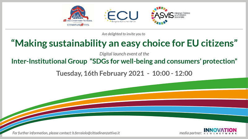 Promosso da Cittadinanzattiva - attraverso la sua rete europea Active Citizenship Network (ACN) - dall’associazione europea dei consumatori “European Consumers Union” (ECU) e dall’Alleanza Italiana per lo Sviluppo Sostenibile (ASviS), sarà presentato ufficialmente il Gruppo Inter-Istituzionale “SDGs for well-being and consumers' protection”, al momento sostenuto da ottoeurodeputati, di diversi Paesi e gruppi politici. Alla conferenza parteciperanno anche rappresentanti della Commissione Europea e del Comitato Economico e Sociale Europeo, sottolineando l'interesse per l'iniziativa.