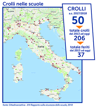 Ben cinquanta gli episodi di crolli e di distacchi di intonaco registrati da Cittadinanzattiva, tramite la stampa locale, tra settembre 2017 e settembre 2018. Parliamo di più di un episodio ogni 4 giorni di scuola. Ad essere interessate in particolare scuole della Campania (8 casi), del Lazio (7) e della Lombardia (6). Tali casi hanno provocato il ferimento, per fortuna lieve, di 10 bambini e bambine, di 2 docenti e di 1 addetta alle pulizie.