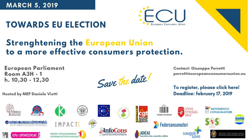 L'European Consumers Union (ECU), di cui Cittadinanzattiva fa parte, realizzerà il prossimo 5 Marzo al Parlamento Europeo l'evento: ““Verso le elezioni europee: rafforzare l’Unione Europea per una maggiore tutela dei consumatori””. La conferenza si terrà nella sala A3H-1 dalle 10:30 alle 12:30, è possibile registrarsi cliccando QUI.