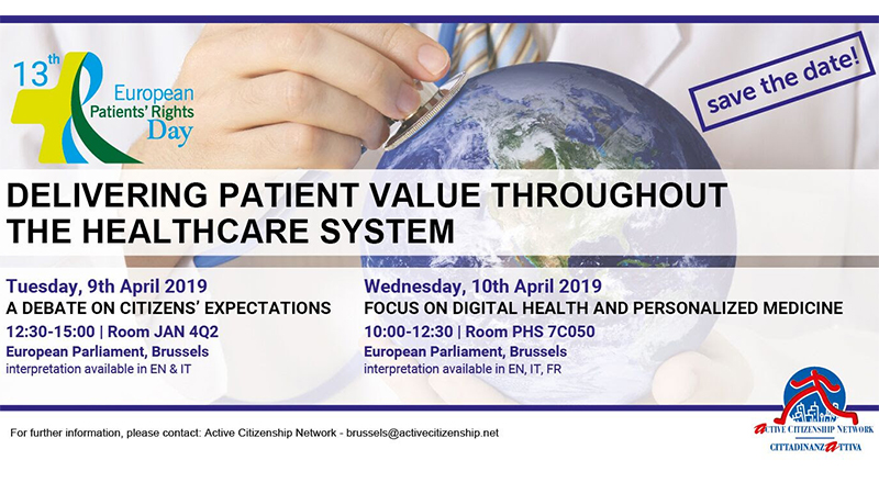 Quest'anno la tredicesima edizione della Giornata Europea dei Diritti del Malato intitolata “Delivering patient value throughout the healthcare system” (nella sua celebrazione internazionale a Bruxelles) avrà una doppia struttura: il 9 Aprile infatti si terrà “Un dibattito sulle aspettative dei cittadini” dalle 12.30 alle 15.00 mentre il giorno successivo, il 10 Aprile dalle 10.00 alle 12.30, si parlerà di "Salute Digitale e Medicina Personalizzata".