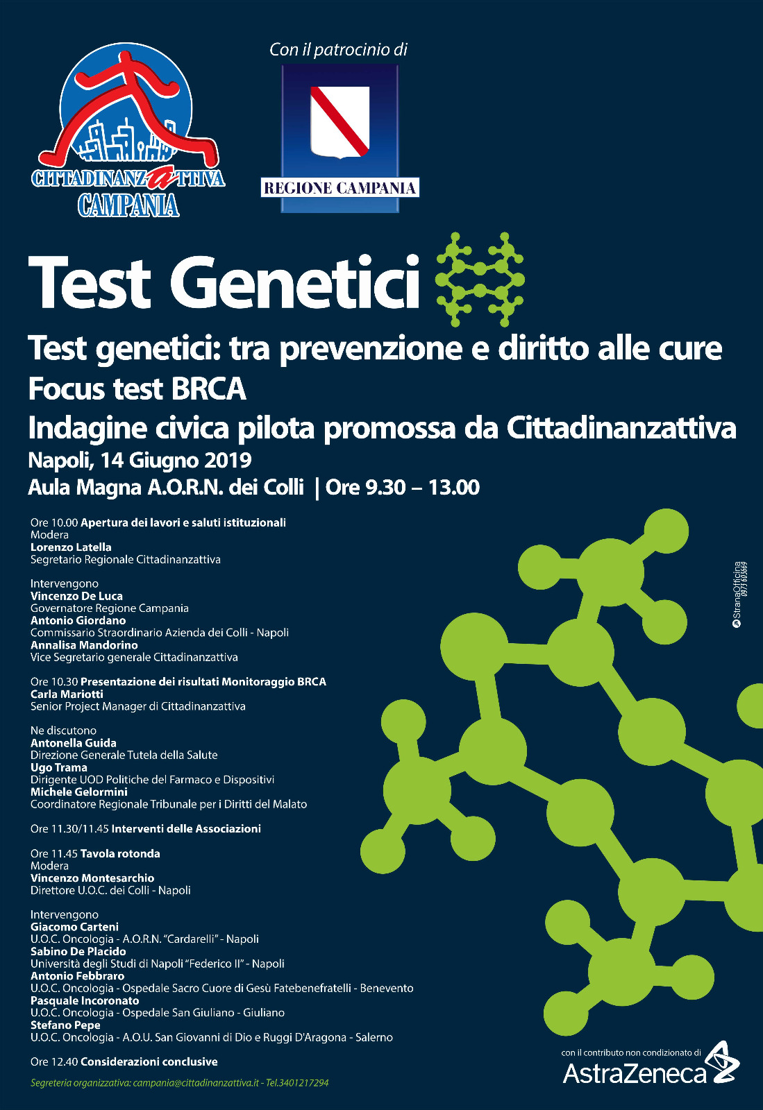 Venerdì 14 giugno dalle ore 9.30 alle 13.30, si terrà a Napoli presso l’Aula Magna A.O.R.N. dei Colli l’evento: “Test Genetici: tra prevenzione e diritto alle Cure – focus Test BRCA”. L’indagine ha interessato sei strutture della Campania e rilevato, attraverso i responsabili dei centri, aspetti peculiari dell’organizzazione dei servizi e del percorso prima e dopo l’erogazione del test BRCA.