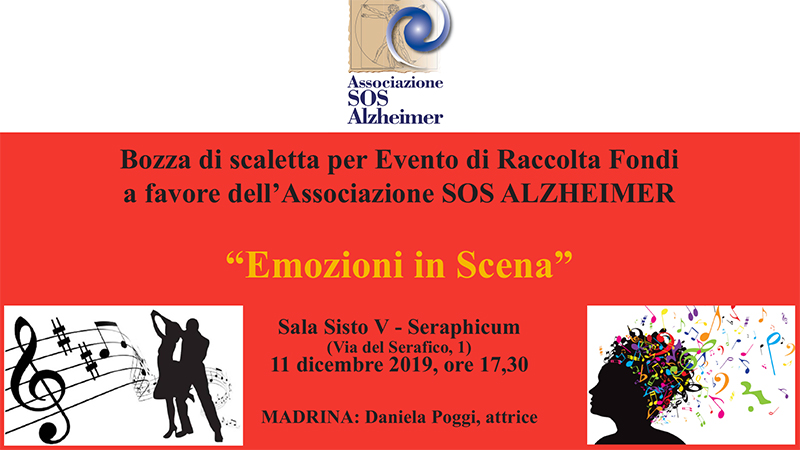 "Emozioni in scena", al Serafico di Roma l'11 dicembre per la raccolta fondi a favore dell'associazione SOS Alzheimer che svolge attività di formazione di personale specializzato e di assistenza qualificata a persone affette da demenza e ai loro familiari.