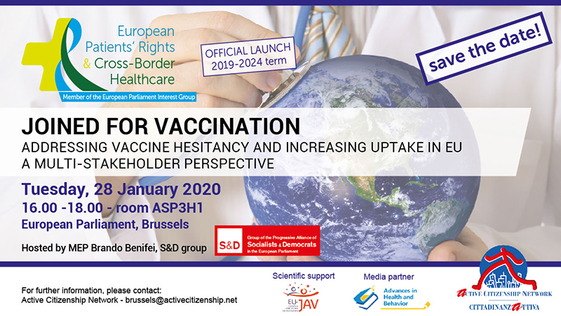 Active Citizenship Network è lieta di invitarti al lancio ufficiale, per la legislatura 2019-2024, del suo Gruppo di Interesse al Parlamento Europeo: "Diritti dei pazienti europei e assistenza sanitaria transfrontaliera". L'evento si terrà a Bruxelles all'interno del Parlamento europeo il 28 gennaio dalle 16:00 alle 18:00 nella sala ASP 3H1. Il titolo sarà "Joined For Vaccination: affrontare l'esitazione vaccinale e aumentare la copertura in UE. Una prospettiva multi-stakeholder”, ospitato dall'eurodeputato italiano Brando Benifei, copresidente del gruppo di interesse.