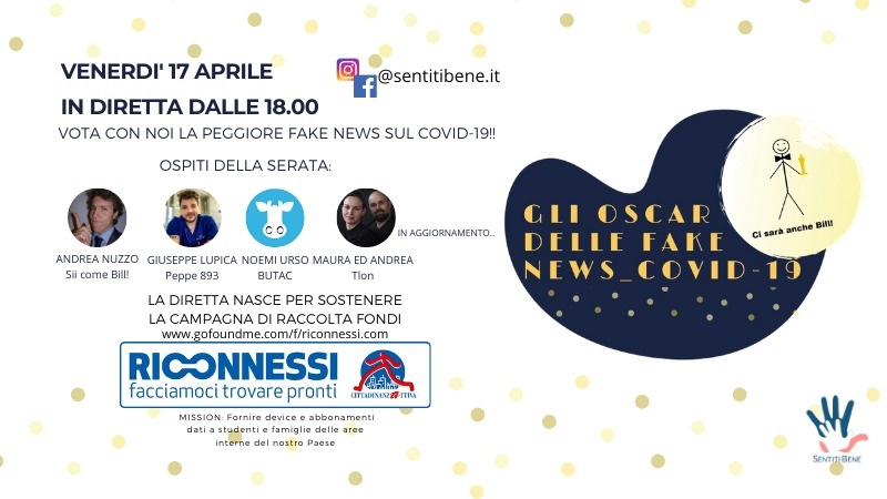 Sentitibene.it ha deciso di dedicare una diretta social venerdì 17 alle ore 18.00, per promuovere la nostra campagna di raccolta fondi, "Riconnessi" che potete trovare a questo link gofundme.com/f/riconnessi, per acquistare tablet, notebook, pc e connessioni per gli studenti che vivono nelle aree interne del Paese, consentendogli di partecipare alle lezioni online.