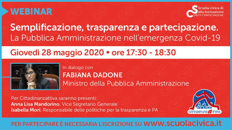 Semplificazione, trasparenza e partecipazione. La Pubblica amministrazione nell’emergenza Covid-19. Si terrà giovedì 28 maggio, dalle 17.30 alle 18.30, il webinar promosso dalla Scuola civica di alta formazione di Cittadinanzattiva (www.scuolacivica.it) “Semplificazione, trasparenza e partecipazione. La Pubblica Amministrazione nell'emergenza Covid-19” con la partecipazione del Ministro della Pubblica Amministrazione, Fabiana Dadone. Il dialogo sarà coordinato dal vice segretario generale di Cittadinanzattiva, Anna Lisa Mandorino.