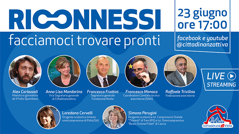 A raccontare oggi queste realtà, nel corso della diretta ore 17:00-18:00 sulla pagina Facebook e sul canale Youtube di Cittadinanzattiva, saranno le dirigenti dei due istituti scolastici, Loredana Cervelli per l’Istituto di Polla, e Simona Perugini per le scuole di Cascia e Trevi. Ad affiancarle nella diretta, Alex Corlazzoli, maestro e giornalista de “Il Fatto Quotidiano”, Francesco Frattini, segretario generale Fondazione Roche, Anna Lisa Mandorino, vice segretaria generale di Cittadinanzattiva, Francesco Monaco, Coordinatore Comitato tecnico aree interne (SNAI), Raffaele Trivilino, Federazione delle Aree interne.