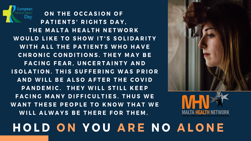 In occasione della Giornata Europea dei Diritti del Malato, Malta Health Network ha mostrato la sua solidarietà a tutti i pazienti che hanno patologie croniche e che, prima e dopo la pandemia, continueranno ad affrontare molte difficoltà tra cui l'isolamento. "Aspetta, non sei solo!"