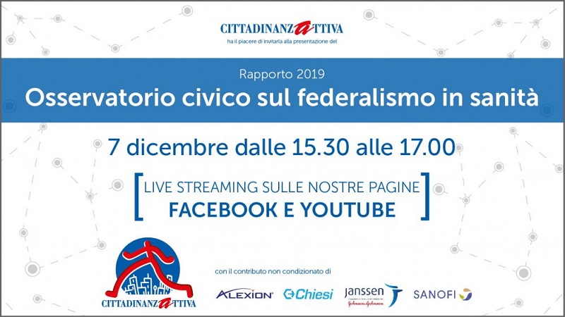 Il 7 dicembre 2020 in modalità streaming dalle h. 15.30 alle h. 17.00 si terrà la presentazione del Rapporto 2019 dell'Osservatorio civico sul federalismo in sanità. L'evento, organizzato da Cittadinanzattiva con il contributo non condizionato di Alexion, Chiesi, Janssen e Sanofi, sarà accessibile attraverso i canali  Facebook e Youtube di Cittadinanzattiva.