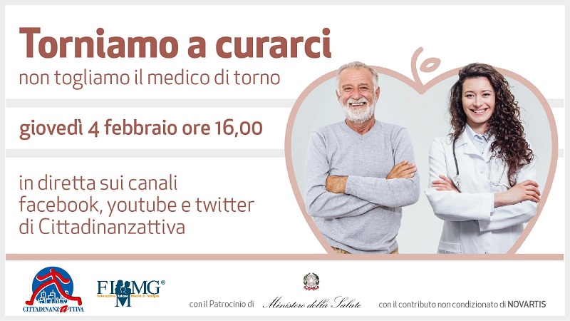 Il 4 febbraio online con Cittadinanzattiva, FIMMG, Novartis e Ministero della Salute, FIMP e FAIS, per l'evento "Professionisti sanitari e cittadini: tra covid e bisogni di salute". L'appuntamento sarà trasmesso online sui canali social di Cittadinanzattiva e rientra nella campagna "Torniamo a curarci - Non togliamo il medico di torno".