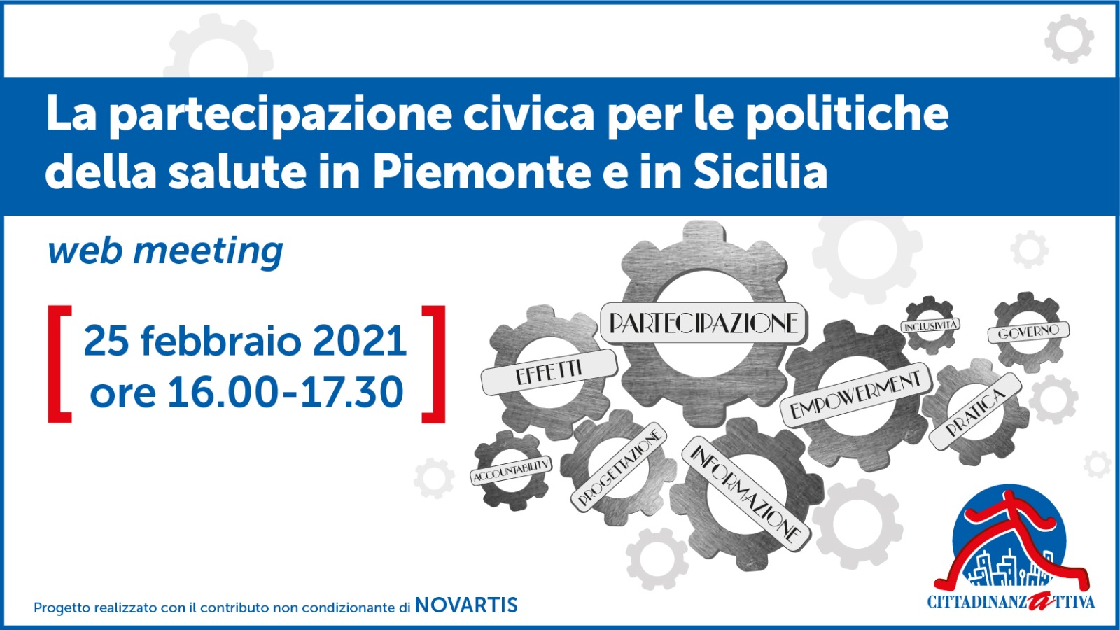 Il web meeting dal titolo "La partecipazione civica per le politiche della salute in Piemonte e in Sicilia” - evento conclusivo in programma il 26 febbraio alle ore 16 - ha l'obiettivo di raccontare i risultati dei due percorsi regionali del nostro progetto “Partecipazione civica in sanità, qualificare le pratiche di democrazia partecipativa”, reso possibile grazie al contributo non condizionante di Novartis. Grazie alla attivazione di due percorsi regionali paralleli, uno in Sicilia e l’altro in Piemonte, abbiamo messo in pratica, sperimentandole, le indicazioni della Matrice per la qualità delle pratiche partecipative in sanità, risultato finale della prima edizione del progetto “Consultazione sulla partecipazione civica in sanità” che ha visto coinvolti oltre 100 stakeholder.