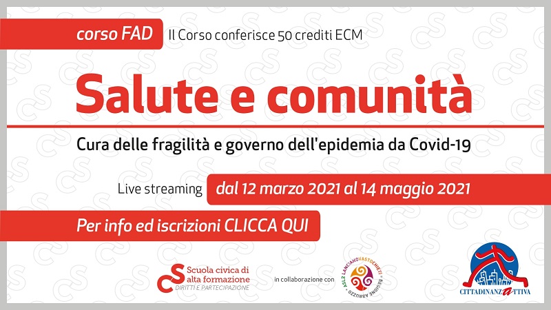 Venerdì 12 marzo dalle 9:30 alle 13:00 si svolgerà la prima giornata del webinar ECM live streaming dal titolo “Salute e comunità. Cura delle fragilità e governo dell’epidemia da Covid 19”. Il corso, promosso dalla Scuola civica di alta formazione di Cittadinanzattiva in collaborazione con la Asl2Abruzzo si svolgerà dal 12 marzo al 14 maggio, durerà circa 60 ore sviluppandosi in quattro moduli di due giornate ciascuno e in un workshop finale. La formazione è rivolta a professionisti sanitari (infermieri di famiglia e comunità, medici USCA, fisioterapisti) assistenti sociali, operatori socio-sanitari, caregivers e referenti di associazioni di cittadini e pazienti, operanti nelle Aree interne della Regione Abruzzo La finalità generale è quella di sostenere nuovi e innovativi modelli di presa in cura delle fragilità, anche alla luce dell’epidemia da Covid-19 che ha indubbiamente messo in risalto l’urgenza d un cambiamento nel paradigma di cura, che punti a sostenere gli individui, le famiglie e la comunità promuovendo corrette risposte adattive alla fragilità in qualsiasi aspetto essa si manifesti e avvalorando un approccio centrato sulla forza della comunità.