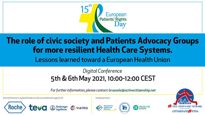 Active Citizenship Network (ACN) è lieta di invitarvi alla XV Giornata Europea dei Diritti del Malato che sarà celebrata con una conferenza digitale il 5 e 6 maggio 2021 dal titolo "Il ruolo della società civile per sistemi sanitari più resilienti. Lezioni apprese verso un'Unione Europea della Salute”.