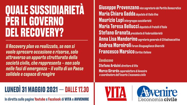 Per porre questi temi ai partiti politici, Vita con Avvenire organizzano un appuntamento web in cui quattro rappresentanti della società civile, Andrea Morniroli di Forum DD, Francesco Marsico di Caritas, Stefano Granata, presidente di Federsolidarietà e Anna Lisa Mandorino segretaria generale di Cittadinanzattiva, interloquiranno con i rappresentanti dei partiti, Giuseppe Provenzano, vice segretario del Partito democratico, Maria Chiara Gadda, deputata di Italia viva, Maria Teresa Bellucci deputata di Fratelli d'Italia e Maurizio Lupi, coordinatore dell'Intergruppo della Siussidiarietà e deputato di Noi con l'Italia.