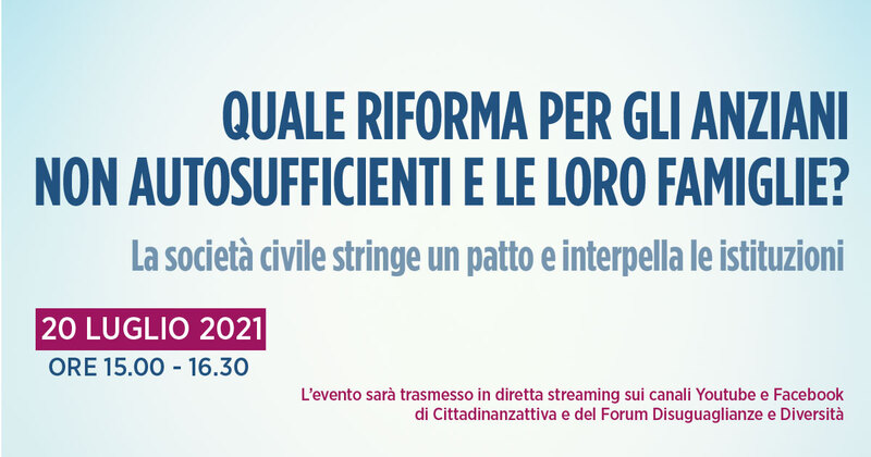 È questa in sintesi la riforma che il neonato “Patto per un nuovo welfare sulla non autosufficienza” chiede al Parlamento e ai Ministri della Salute Roberto Speranza e del Lavoro e delle Politiche sociali Andrea Orlando, presenti oggi all’evento trasmesso sulle pagine social di Cittadinanzattiva e del Forum Disuguaglianze e Diversità.