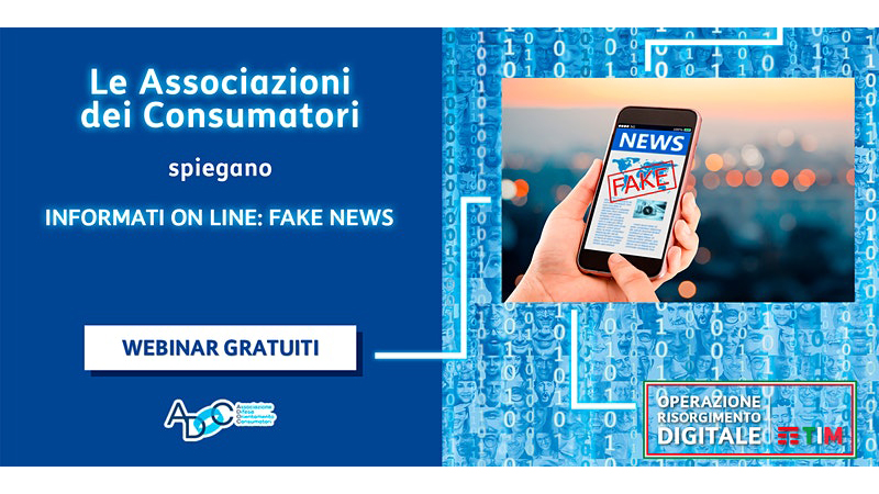 l prossimi incontri del percorso formativo gratuito "consumatori digitali, consapevoli e sicuri" vedranno Immacolata D’Aquino, Vicepresidente dell’Adoc (Associazione Difesa Orientamento Consumatori) Napoli e Campania il 30 novembre e il 2 dicembre accompagnarci nel webinar "Informati online: le Fake News". Gli incontri saranno incentrati sulla questione delle fake news, l’inquinamento delle informazioni. Più nel dettaglio, si esamineranno le cattive notizie da un punto di vista storico per poi illustrare qual è la loro origine e come si diffondono, concludendo con dei primi passi per difendersi.