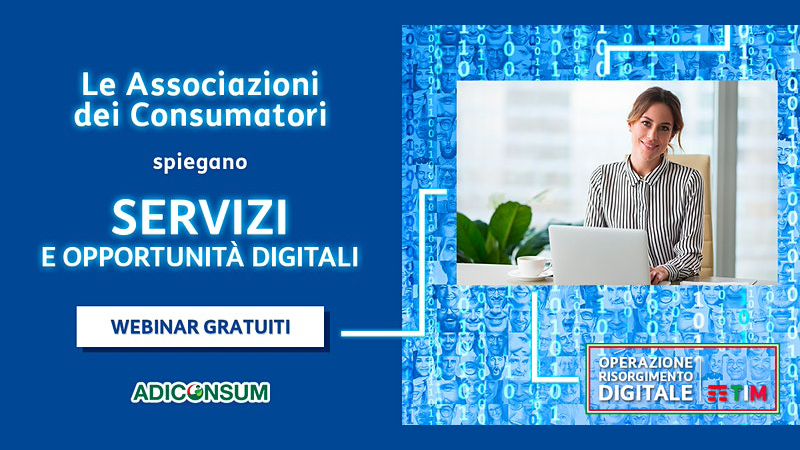 l prossimi incontri del percorso formativo gratuito "consumatori digitali, consapevoli e sicuri" vedranno Stefano Epifani, Presidente del Digital Transformation Institute, Sonia Montegiove Direttrice Editoriale di Tech Economy 2030 e Mauro Vergari responsabile del settore Telecomunicazioni e Trasporti nonché dell’Ufficio studi, ricerche e innovazioni di ADICONSUM, il 14 e 16 dicembre accompagnarci nel webinar "Servizi e opportunità digitali". Gli incontri sono tesi a formare il “consumatore digitale” in grado di sfruttare i nuovi servizi e le opportunità digitali.