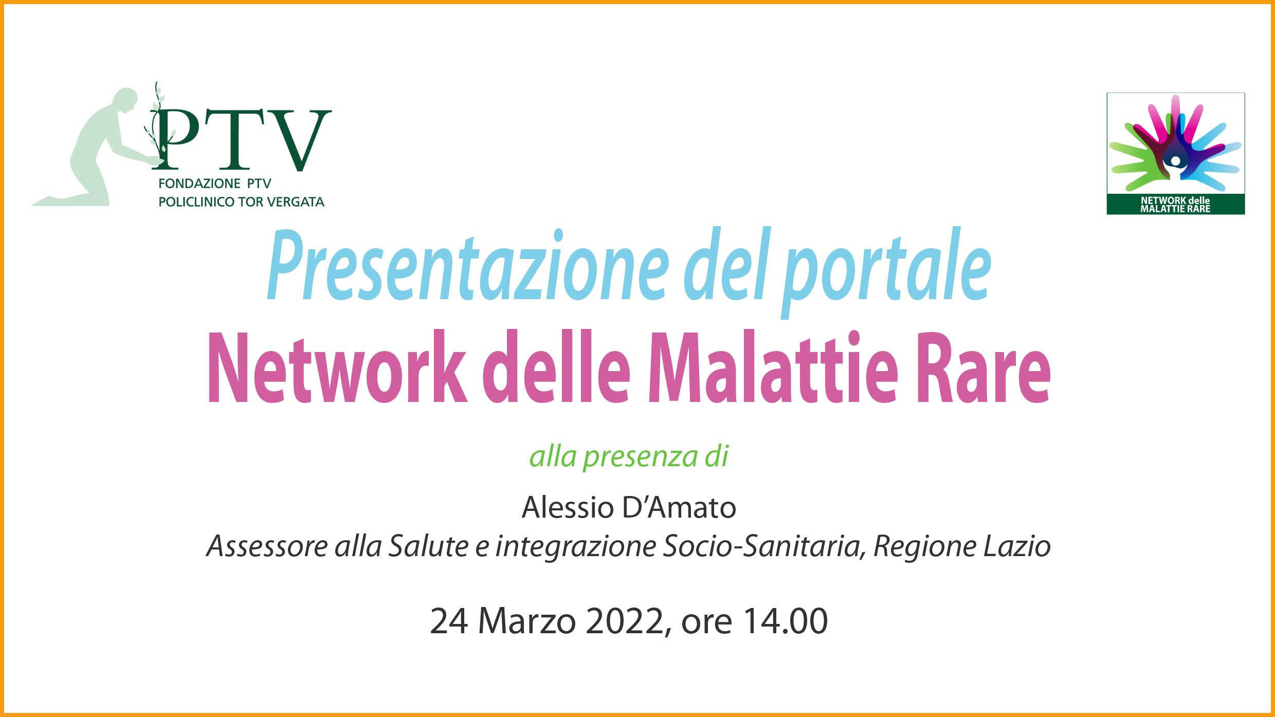 Prevista per il 24 marzo alle ore 14,00 la presentazione del portale Network delle Malattie Rare della Regione Lazio alla presenza dell'Assessore alla salute regionale Alessio D'Amato. Sarà possibile seguire la diretta streaming dell'evento sul canale Youtube del Policlinico Tor Vergata