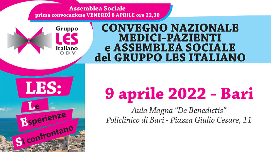 Si svolgerà a Bari il prossimo Convegno Nazionale “LES: Le esperienze Si confrontano” il prossimo 9 aprile 2022 presso l’Aula Magna “De Benedictis” del Policlinico di Bari, in Piazza Giulio Cesare, 11.