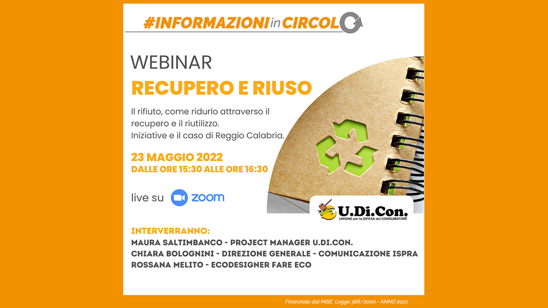 Lunedì si apre il ciclo di 6 incontri online con esperti e consumatori per conoscere l'economia circolare: che cosa è e che impatto ha sulla vita dei cittadini? Il 23 maggio alle ore 15.30 in diretta sulla pagina facebook di U.Di.Con. si parlerà di recupero e riuso con la dott.ssa Bolognini di ISPRA e con la dott.ssa Rossana Melito di FARE ECO. L'evento sarà trasmesso in diretta anche in lingua dei segni.