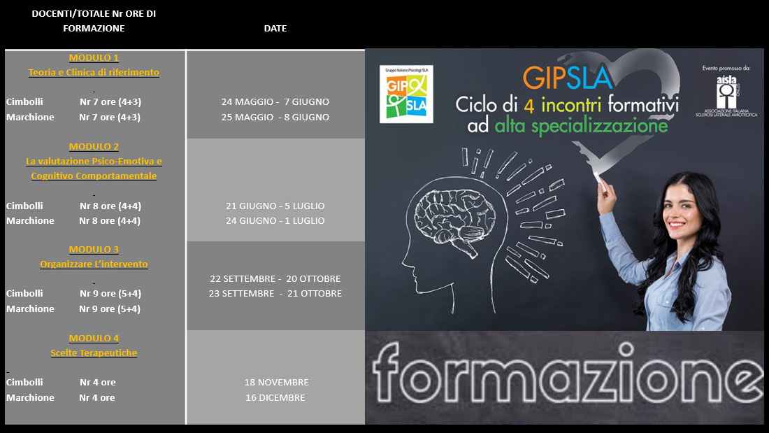 AISLA, Associazione italiana sclerosi laterale amiotrofica, organizza un corso di formazione sulla SLA dedicato esclusivamente agli psicologi interessati ad aggiornarsi o approfondire il tema. Il corso è totalmente gratuito ed è strutturato in quattro moduli didattici, che si svolgeranno a distanza e saranno suddivisi in unità tematiche.