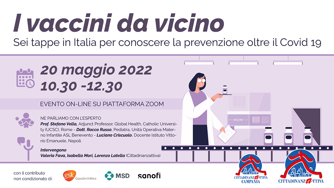 Penultimo appuntamento dei 6 talk show di Cittadinanzattiva dal titolo: "I vaccini da vicino. Sei tappe in Italia per conoscere la prevenzione oltre il Covid 19". Il prossimo 20 maggio alle ore 10.30 è in programma l'evento on-line su ZOOM dedicato alla Regione Campania. Esperti e Istituzioni dialogheranno insieme ai cittadini sulla importanza della vaccinazione e della prevenzione.