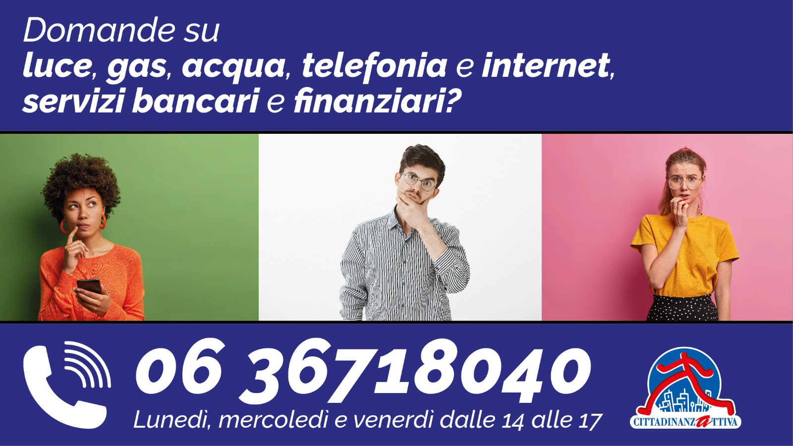 - uno sportello telefonico raggiungibile al numero 0636718040, il lunedì, il mercoledì e il venerdì dalle 14 alle 17. Chiamandoci potrai ricevere informazioni e assistenza per questioni riguardanti: energia elettrica e gas, acqua, telefonia, internet e payTv, servizi bancari e finanziari;