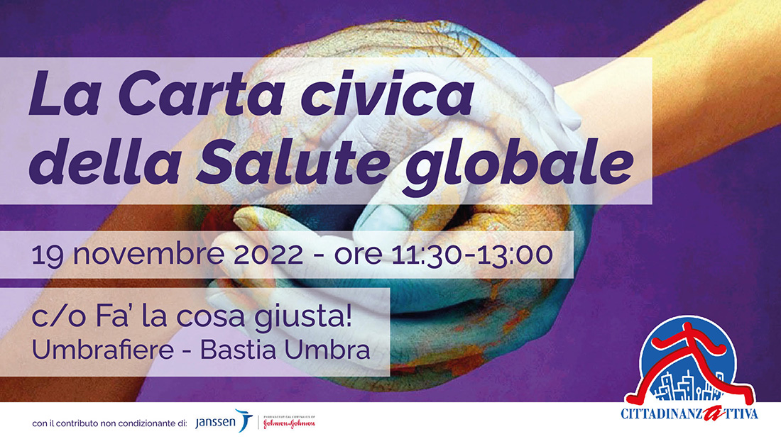 Cittadinanzattiva è lieta di invitarvi alla presentazione della prima Carta civica della salute globale che si svolgerà il 19 novembre 2022 dalle ore 11:30 alle ore 13:00 nell'ambito di Fà la cosa giusta! presso Umbriafiere a Bastia Umbra.