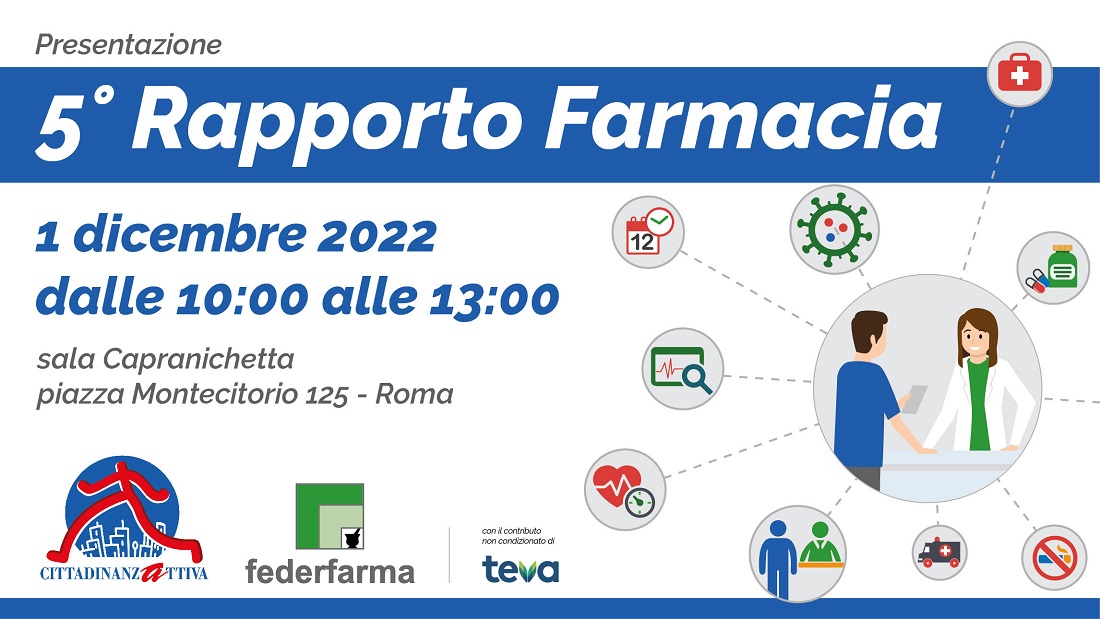 Cittadinanzattiva è lieta di invitarvi alla presentazione del V Rapporto Annuale sulla Farmacia, che si svolgerà in un evento in presenza il 1° dicembre alle ore 10:00 a Roma presso la Sala Capranichetta, Piazza Montecitorio 125.