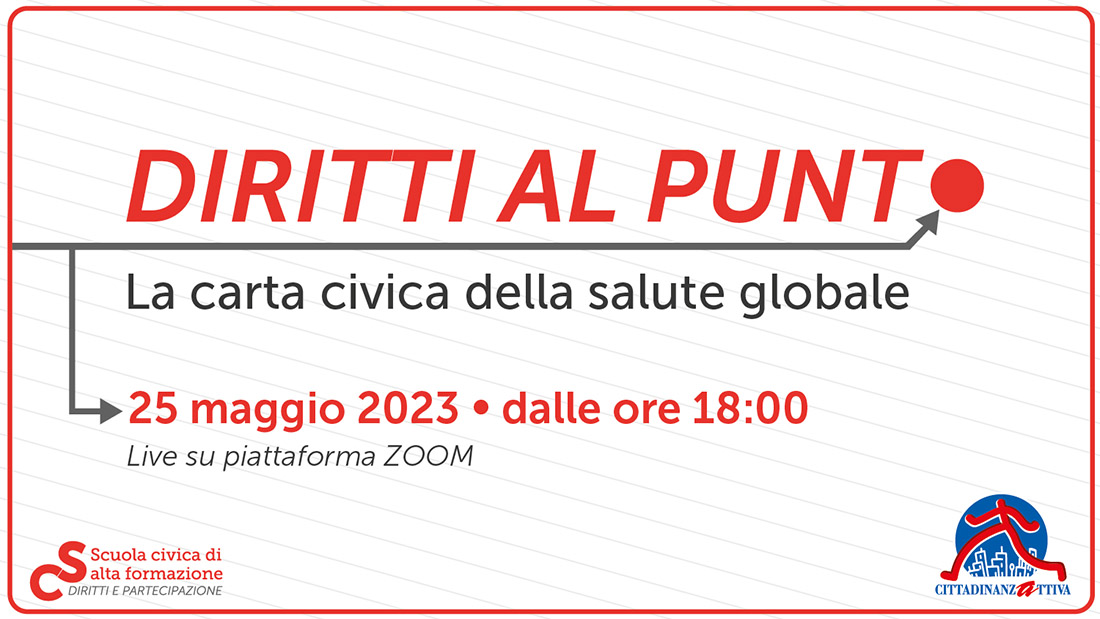 Il prossimo 25 maggio, dalle ore 18.00 alle ore 19.00, nel consueto incontro mensile di Diritti al punto parleremo della “Carta civica della salute globale” promossa da Cittadinanzattiva con il coinvolgimento di numerosi soggetti civici ed esperti.