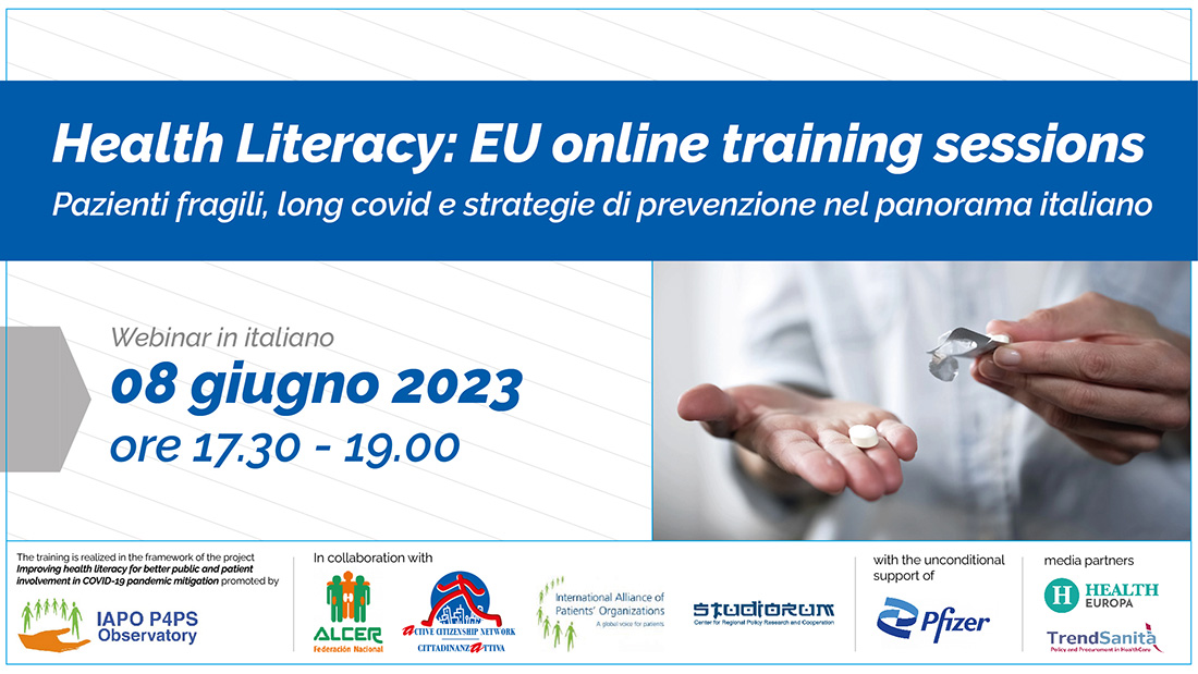 Il prossimo 8 giugno Active Citizen Network, in collaborazione con la Scuola civica di alta formazione propone un evento di formazione online su Health literacy: Knowing and Mitigating the Impact of COVID-19. "Pazienti fragili, long covid e strategie di prevenzione nel panorama italiano". L’evento è rivolto ai coordinatori regionali di Cittadinanzattiva, a coloro che si occupano di tutela e a tutti quegli informatori di prossimità che possono beneficiare di una conoscenza corretta e puntuale sui temi inerenti covid, long covid e fragilità.