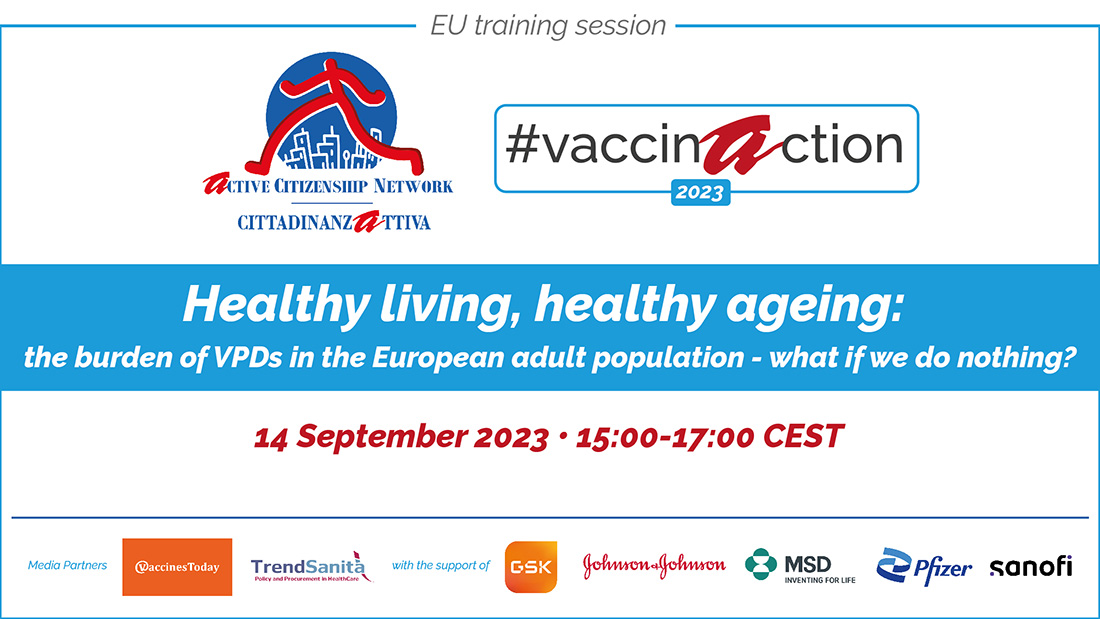 Nell'ambito del progetto europeo #VaccinAction2023, Active Citizenship Network è lieta di invitarvi il 14 settembre 2023, dalle 15:00 alle 17:00 CEST, all'evento online intitolato "Healthy Living, healthy ageing: the burden of VPDs in the European Adult population - what if we do nothing?". Le malattie prevenibili da vaccino (VPD) sono malattie causate da batteri e virus che possono essere prevenute con i vaccini.
