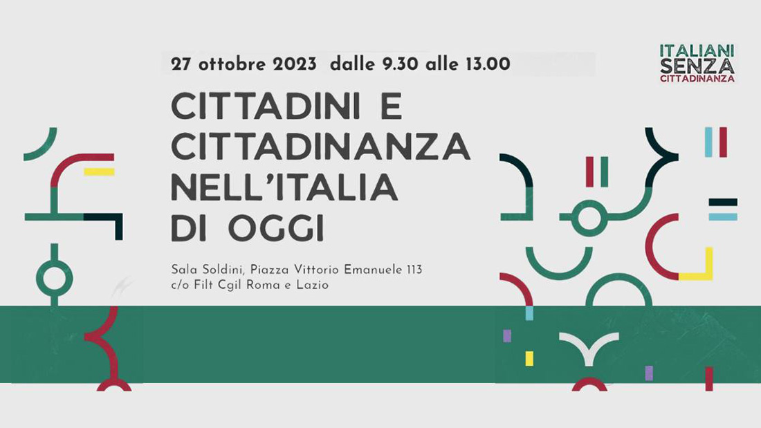 Venerdì 27 ottobre, dalle ore 9:00 alle ore 14:00, presso la Sala Soldini in Piazza Vittorio Emanuele 113, a Roma, si terrà il Convegno “Cittadine e cittadini nell’Italia di oggi” organizzato dal Movimento Italiani Senza Cittadinanza. L'obiettivo dell'evento è riunire una varietà di voci esperte ed attiviste che credono nel potere del dialogo e dell'azione collettiva per esaminare insieme la situazione attuale del diritto della cittadinanza, identificare le aree di miglioramento e trovare spunti per affrontare le sfide con resilienza e creatività.