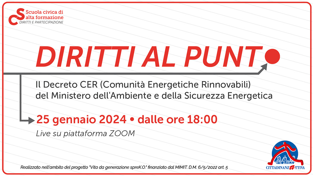 Il prossimo 25 gennaio, dalle ore 18.00 alle 19.00, riprendono gli appuntamenti di Diritti al punto, uno spazio con il quale si vuole contribuire alla conoscenza puntuale di contenuti, iter istituzionali, punti di forza e di debolezza di quei documenti normativi che, per oggetto e rilevanza, risultano centrali nelle attività di tutela di Cittadinanzattiva e delle organizzazioni che hanno con lei un patto di collaborazione.