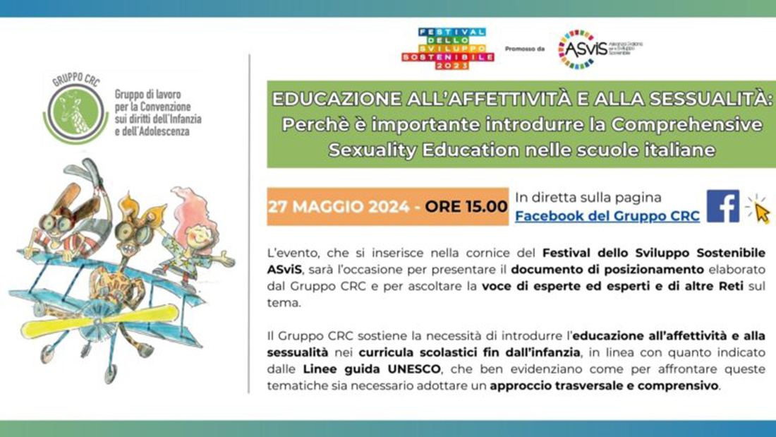 Lunedì 27 maggio 2024, dalle ore 15.00 alle ore 17.00, il Gruppo CRC organizza un evento dal titolo “Educazione all’affettività e alla sessualità: Perchè è importante introdurre la Comprehensive Sexuality Education nelle scuole italiane“.