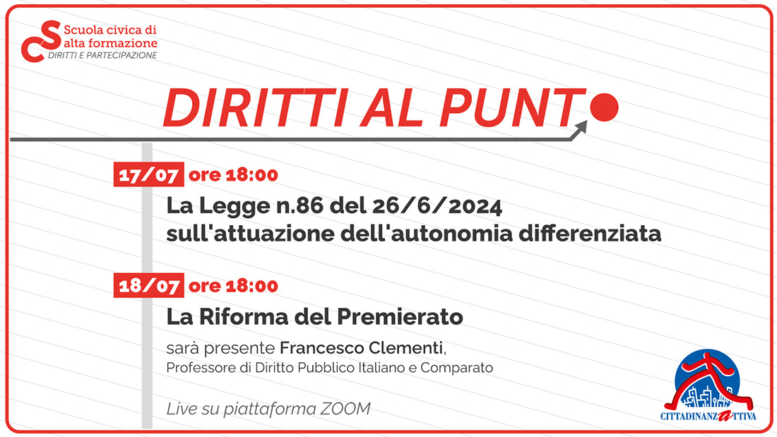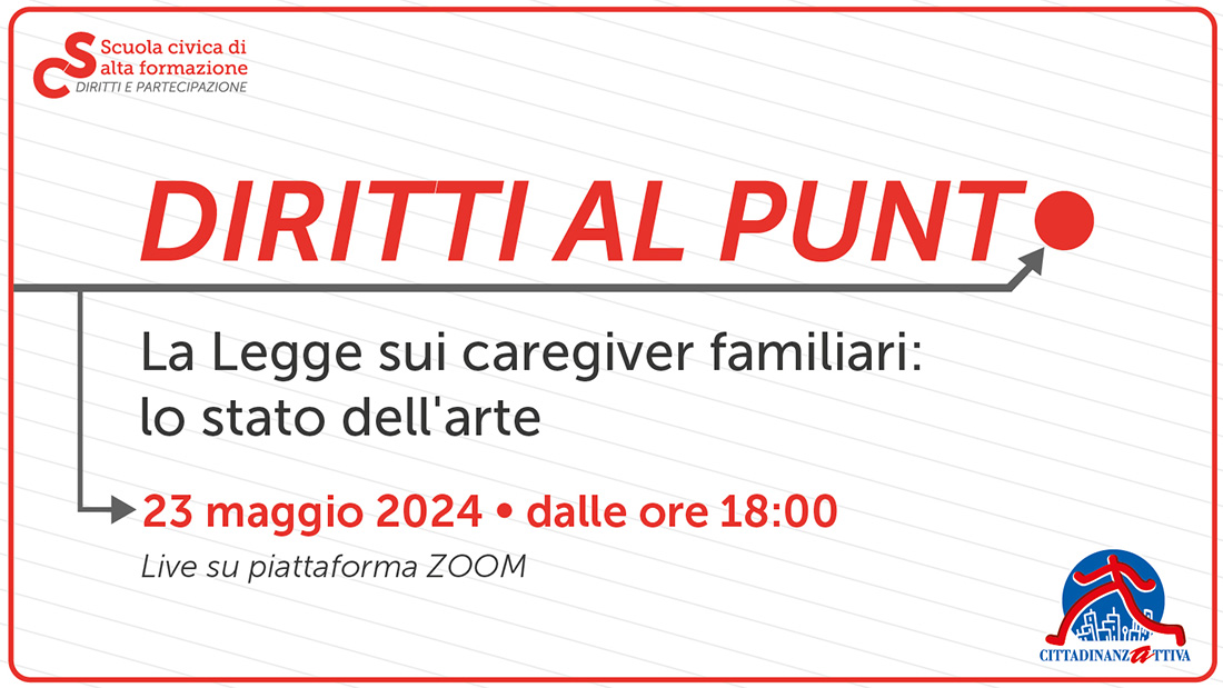 Giovedì 23 maggio, dalle 18:00 alle 19:00, vi invitiamo a partecipare al consueto appuntamento mensile di "Diritti al punto", in un incontro dedicato alla Legge sui caregiver familiari, durante il quale condivideremo lo stato attuale delle iniziative legislative in corso.