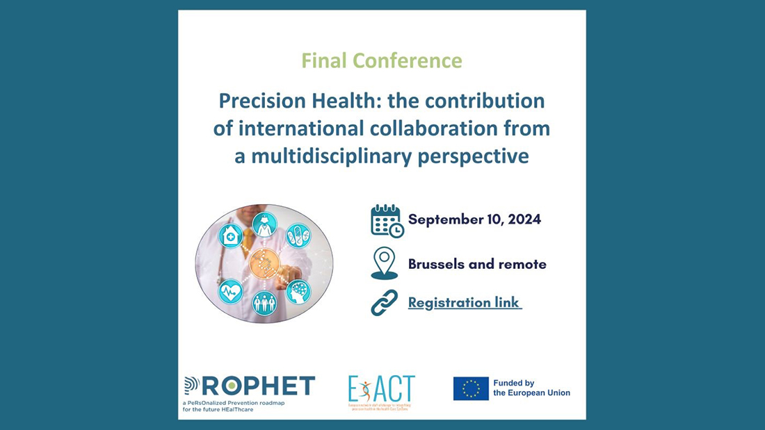 Il progetto ExACT (European network staff eXchange for integrAting precision health in the health Care sysTems) annuncia la sua Conferenza finale sulla Salute di Precisione. Le sessioni copriranno diversi argomenti rilevanti, con un'enfasi particolare sull'Innovazione e sui modelli multidisciplinari per coinvolgere gli stakeholder nella salute di precisione. PROPHET, il progetto europeo sulla prevenzione personalizzata in cui Cittadinanzattiva è partner, sarà protagonista nella seconda parte della giornata, evidenziando la creazione di sinergie nel quadro della ricerca dell'UE.