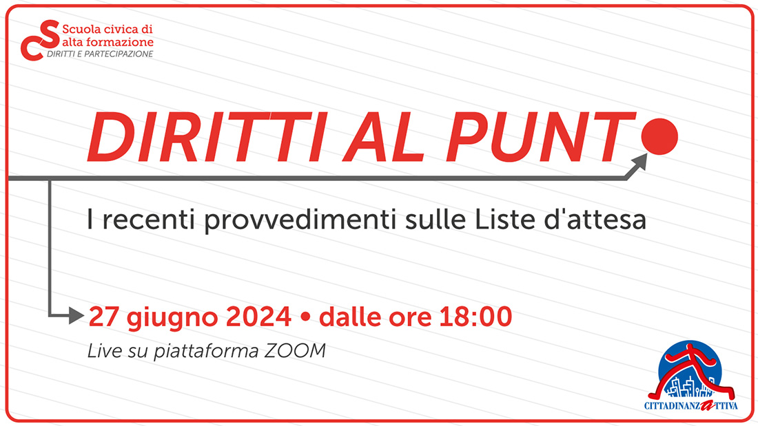 Giovedì 27 giugno 2024, dalle ore 18:00 alle 19:00, siete invitati a un nuovo appuntamento di “Diritti al punto”, dedicato ai recenti provvedimenti sulle liste d’attesa.