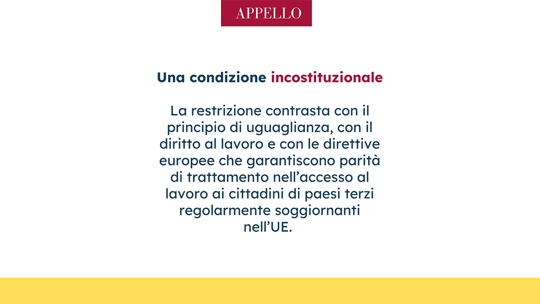 Con questo appello ASGI e le associazioni firmatarie intendono quindi denunciare l'illegittimità e l'irragionevolezza di questo requisito, che rischia di escludere moltissime persone straniere che già esercitano o si stanno formando per esercitare queste professioni.