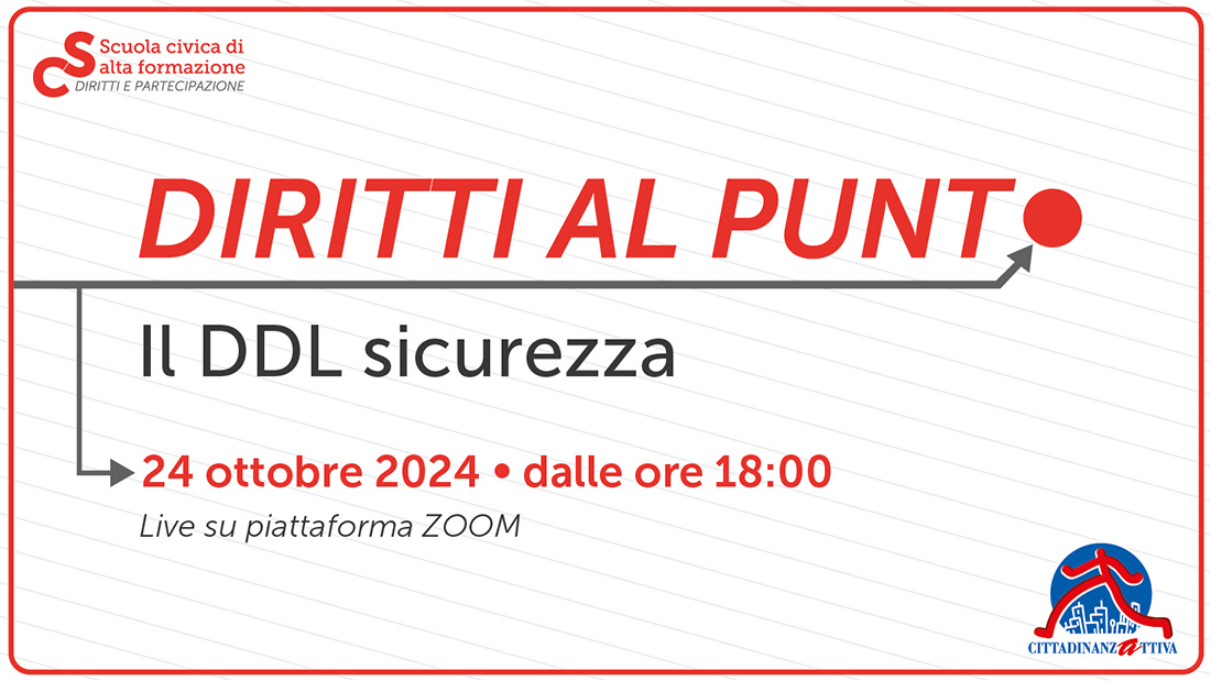 Vi aspettiamo, quindi, al nostro consueto appuntamento di Diritti al punto, on line, il prossimo giovedì 24 ottobre 2024 alle ore 18:00 alle 19:30. Sarà un’edizione un po’ speciale: non ci limiteremo solo all’informazione, ma porremo le basi per la costruzione di una nostra azione in merito.
