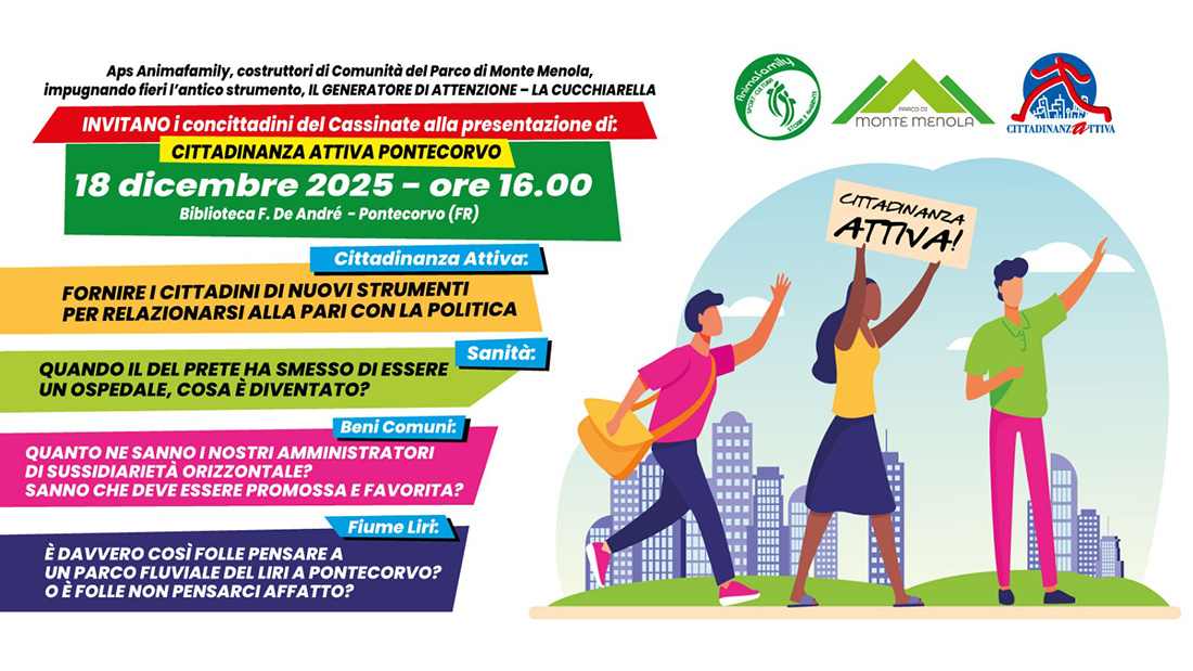 Animafamily APS, con il supporto di Cittadinanzattiva Lazio, lancia “Cittadinanza Attiva Pontecorvo”, un percorso pensato per offrire ai cittadini strumenti concreti per partecipare alla vita pubblica e relazionarsi alla pari con la politica. L’iniziativa nasce dall’esperienza ventennale di Animafamily nel territorio e dal modello di attivazione civica sviluppato nel Parco di Monte Menola, oggi esempio regionale di bene comune rigenerato grazie all’impegno diretto della comunità.